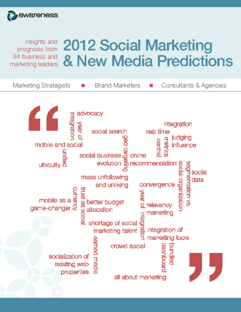 This whitepaper from Awareness Inc contains advice, predictions, and insights from leading marketing consultants, brand marketers, social media experts, and marketing strategists. Want to improve your marketing efforts in 2013? This whitepaper prepares marketers, entrepreneurs and business leaders for changes in the coming year. In 2013 we need new approaches to marketing as we move away from customer relationship management to relationships managed by customers. This whitepaper features: