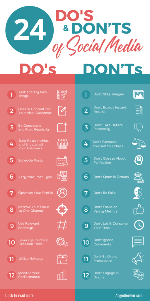 Angie Gensler, a social media advisor has put together this infographic with 24 do’s and dont’s of social media marketing to ensure that you’re on the right track.