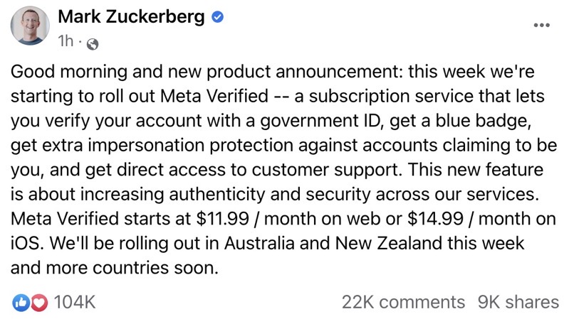“To help up-and-coming creators grow their presence and build community faster, we’ll begin testing a new offering called Meta Verified, a subscription bundle on Instagram and Facebook that includes a verified badge, which authenticates your account with government ID, proactive account protection, access to account support, and increased visibility and reach. We’re starting with a gradual test in Australia and New Zealand later this week to learn what’s most valuable, and we hope to bring Meta Verified to the rest of the world soon.”