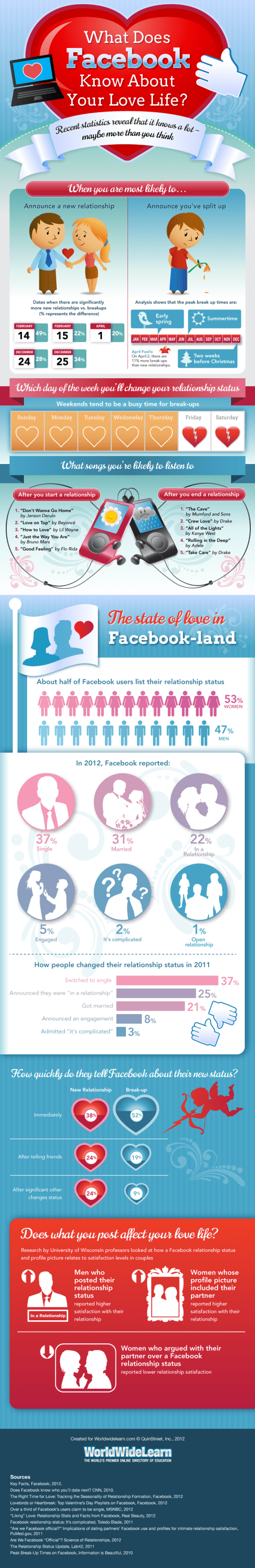 This infographic created by WorldWideLearn does into detail with recent social media statistics about what Facebook knows about your love life.