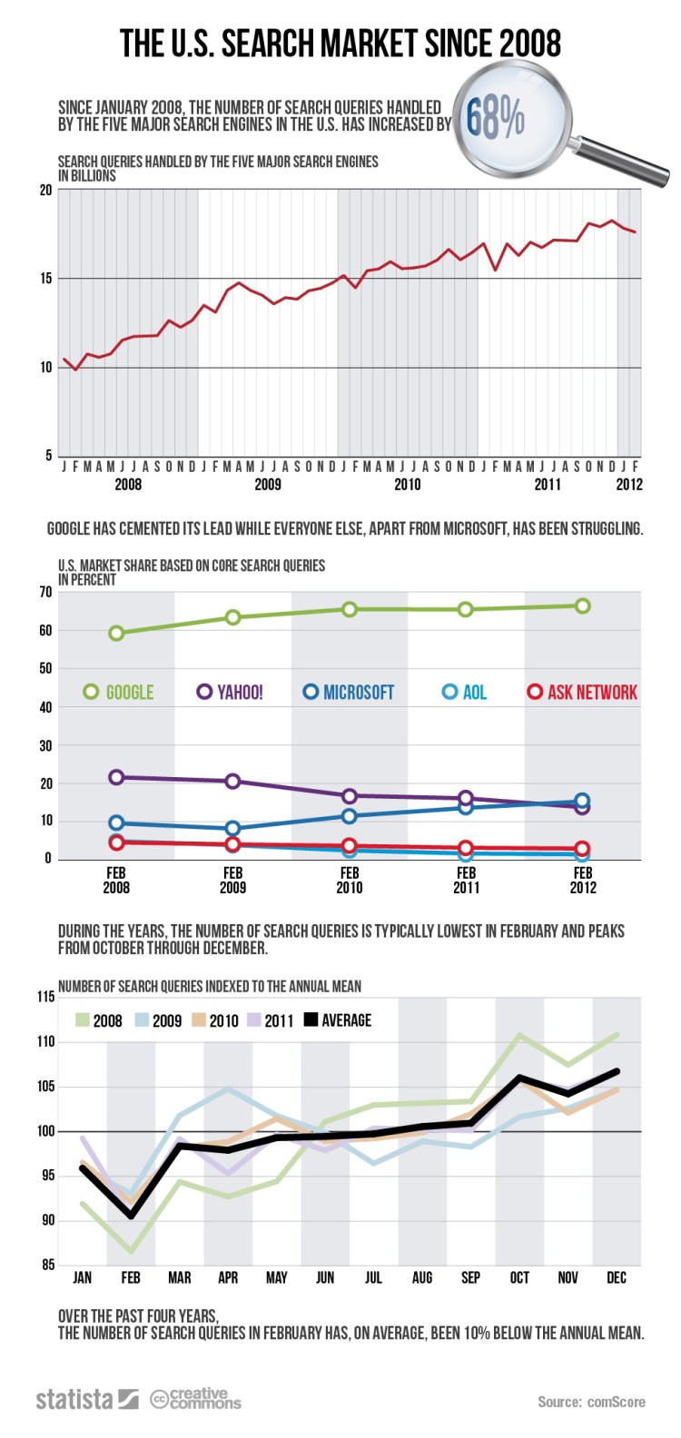 Statista have compiled search data for this infographic from 2008 to the present about search engine wars and yearly trends.