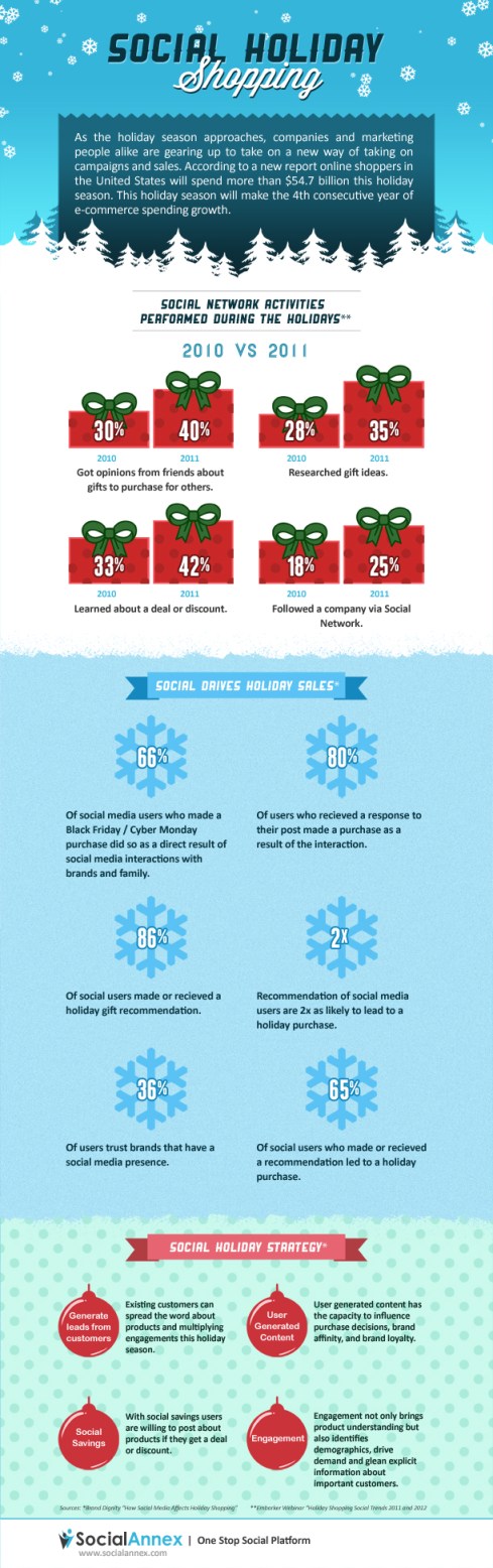 Social Holiday Shopping 2010 VS 2011 trends. As the holiday season approaches, companies and marketers together are gearing up and preparing a new approach to holiday advertising campaigns and sales. They are doing this by incorporating innovative social media strategies to reach customers in the 54.7 billion USA holiday season according to a new report.