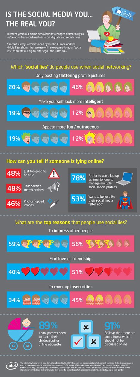 Vanity is the Name of Social Media? Is the social media YOU the real YOU? Social networking infographic on online behavior with digital media. Via intel